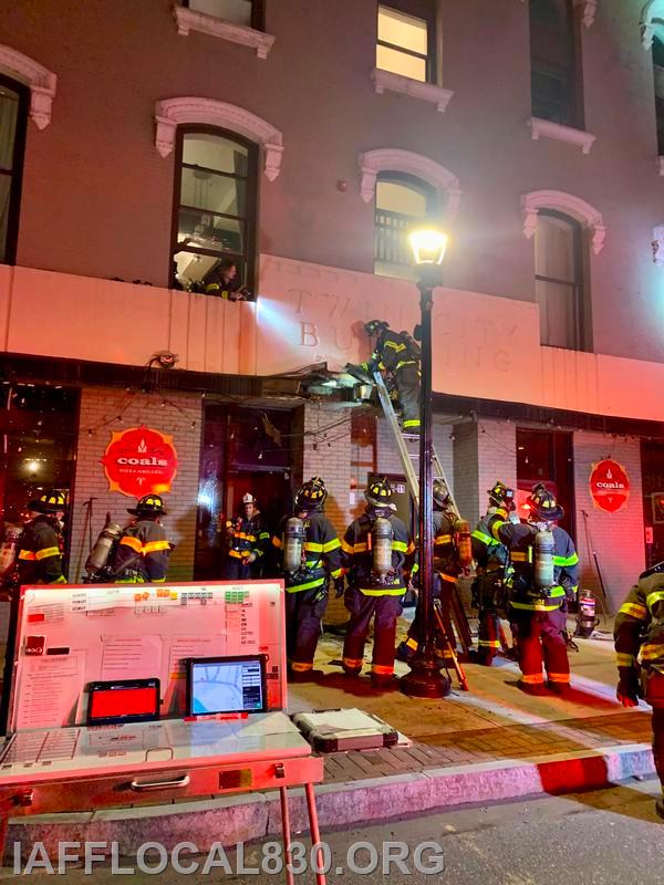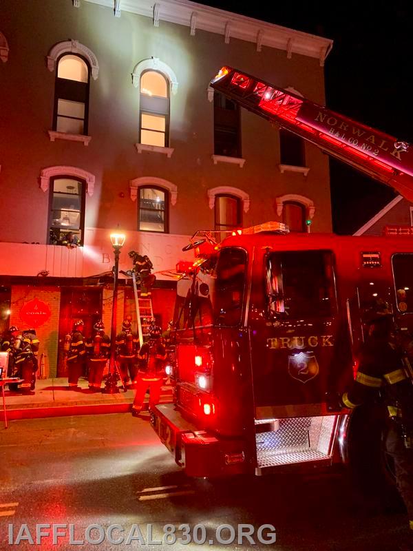 Norwalk Professional Firefighters arrived to find smoke in the 1st floor restaurant and common hallway of the apartments above. A fire in an exterior facade/ soffit was located and quickly extinguished. The original assignment of 3 Engine Companies, 2 Truck Companies, a Heavy Rescue Company, Shift Commander and support staff was scaled back as the incident was placed under control.